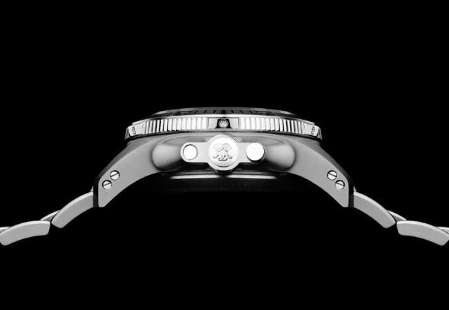 Submarine Warfare的錶殼由鈦金屬鑄造而成,一體成形,堅固輕巧。而採用不銹鋼製造的單向轉動錶圈更有兩種款式,切合簡約風格的原不銹鋼色,或經藍色PVD塗層處理的玩味之作可供選擇。錶圈上刻有60分鐘的刻度,鑲嵌了一顆自體發光微型氣燈,原意是讓潛水員可快捷計算已下潛時間,但亦應用於其他活動。而經藍色PVD塗層處理的型號在功能上更進一步,在外圈刻度上採用「Super LumiNova」超級夜光塗層,加強夜視效果。300米的專業防水功能,讓你可無拘無束探索海洋深處;專利的Amortiser®耐震設計,保護機芯免受撞擊影響,讓你果敢發掘新疆界。