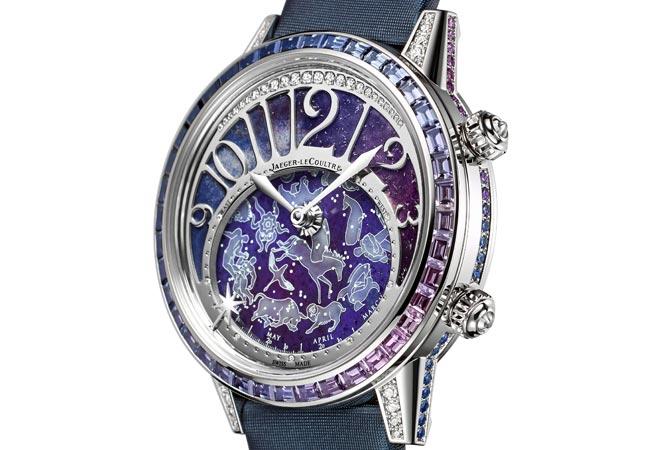 看似柔美卻兼具複雜功能的華麗腕錶,以如夢似幻的極光為靈感精工打造。積家工坊大師在錶圈鑲嵌一輪深淺不同的長方形切工藍寶石,罕見的色澤隨著不同角度折射出微妙光影,展現如星空般的迷幻景致。錶盤上則以粉色、藍色及紫色的珍稀寶石營造出星空般的絢爛色彩,令人醉心神往。圓盤內以純手工方式繪製青金石天象圖,重現璀燦星座及黃道十二宮運行軌跡。藉由積家的珍稀工藝,賦予複雜功能腕錶浪漫嫵媚的柔和樣貌,打造出藝術品般的珍貴時計。