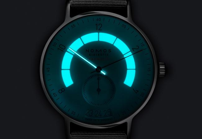 而六點位置的加長型日期窗,可顯示三個不同的日期,即昨天、今天與明天,而這樣巧妙的設計,正如同汽車的里程數字窗。至於面盤上跨越240度的特殊色塊,就如同儀表板上的時速計,搭配色彩鮮明的時針與箭型分針,不僅更接近“速度”的設計靈感,更顛覆了以往NOMOS的設計概念。此外,色塊上的Superluminova螢光塗層使本款腕錶即使在昏暗的夜晚也能清晰顯示時間。