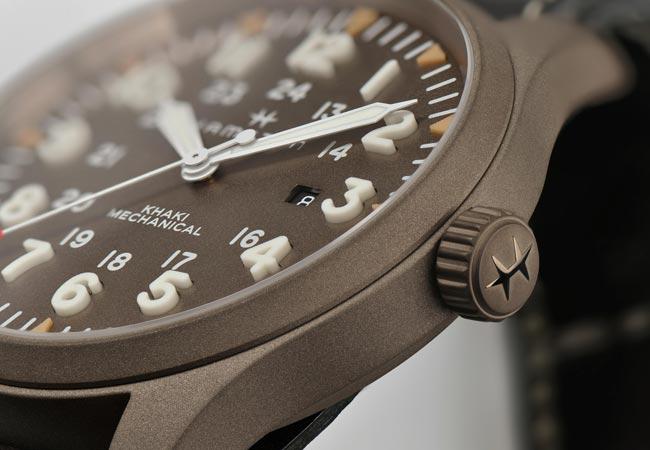 今年度推出的漢米爾頓Khaki Field 50mm卡其陸戰手上鍊限量錶,為品牌自創廠以來,推出市售款式中,最大錶徑與面盤體積的嶄新級距之作,品牌為忠實表現越戰時期軍錶的靈感神韻,品牌在設計上,特別復刻二次大戰期間准將級實驗性配錶的設計靈感;面盤佈局特別沿用二次大戰期間,美軍計時非常風行的厚立體植字,透過重現半世紀未見的工藝創舉,不僅令錶款釋放推陳出新的獨家本色,更使佩戴者舉手投足之間,煥發無與倫比的豪邁氣宇。