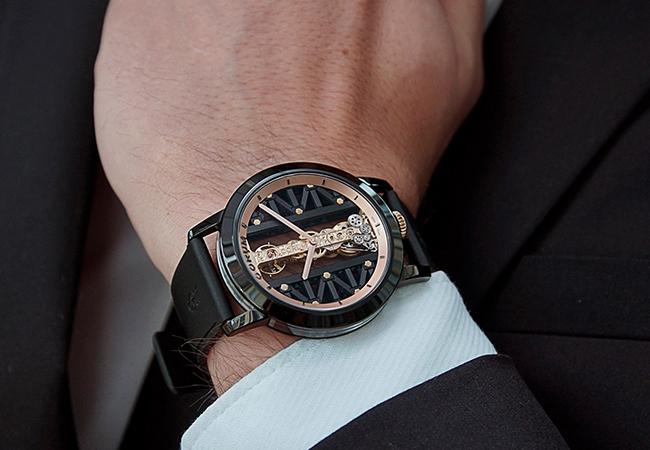 帶有現代設計風格的鏤空面盤,讓內裝CO 410自動上鍊機芯隱約可見。一點鐘位置為自動盤、五點鐘位置為發條盒,機芯運作時的律動,也為錶款加入更多動感,而也更能感覺到品牌量身打造的仿形機芯的用心。有趣的是七點鐘位置的品牌Logo,會隨著手部動作而轉動,為錶款帶來更有玩新的趣味。