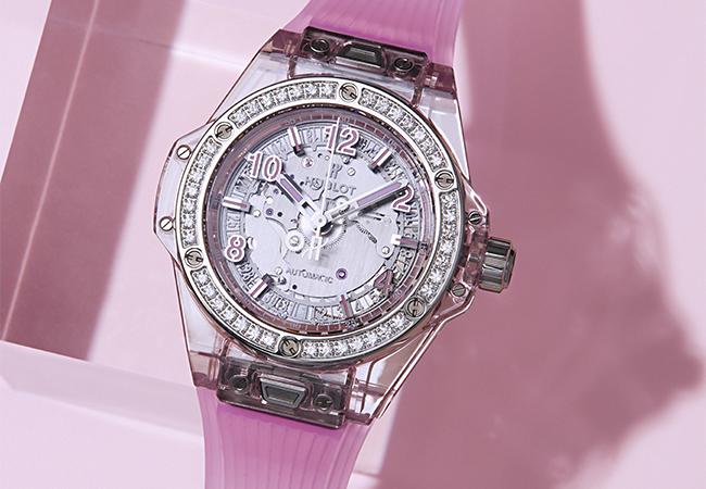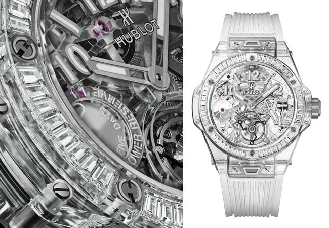 而在2018年推出的Big Bang藍寶石五日動力儲存陀飛輪鑽錶,更是首次把機芯的基板、錶橋都用透明藍寶石製作,僅有少數必要零件仍維持金屬,進一步提高了材料的可塑性,另外,宇舶還特別為錶圈內鑲鑽開發特殊透明黏膠,除了讓方鑽可牢牢固定在錶圈內,甚至連放大鏡都看不出使用黏膠的痕跡。