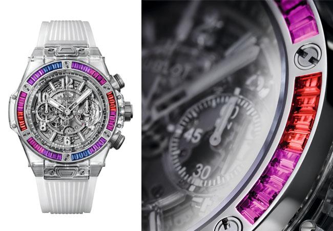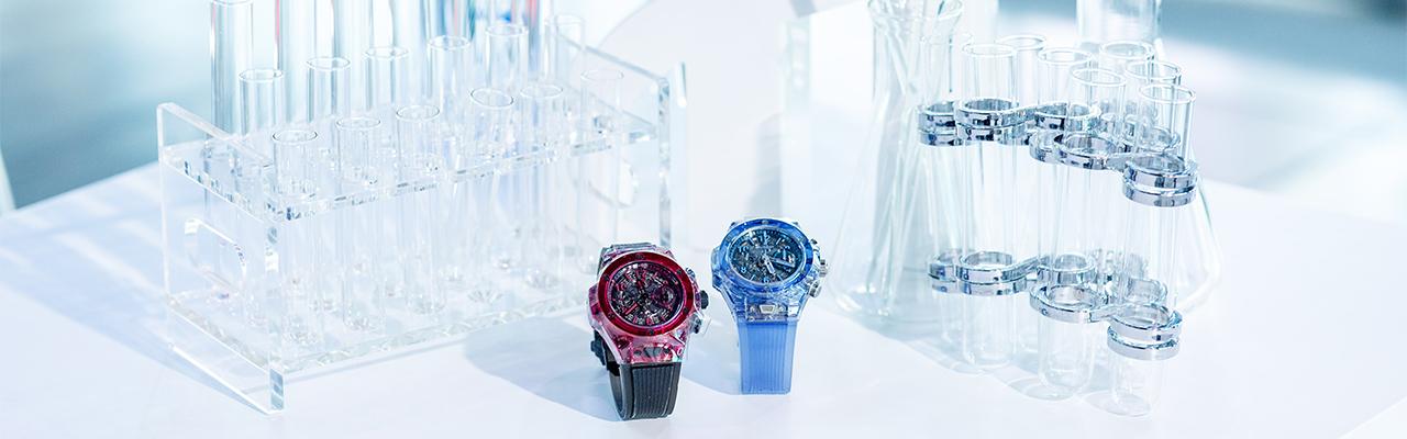 接著,不到一年的時間,克服了透明藍寶石加入色彩的難題,2017年宇舶推出Big Bang Unico藍色藍寶石腕錶,讓原材料氧化鋁(Al2O3)與金屬鉻(Cr)結合,另外還有Big Bang Unico紅色藍寶石腕錶,則是藉由鐵(Fe)與氧化鋁的融合,創造出藍色、紅色的透明藍寶石錶殼,而它們都是透過不斷嘗試金屬元素的搭配,才找到正確的配方,再加溫至攝氏2000到2050度高溫,結晶為完美具色彩的透明藍寶石,並保留藍寶石材質超耐磨的高硬度與完全透明的通透性。