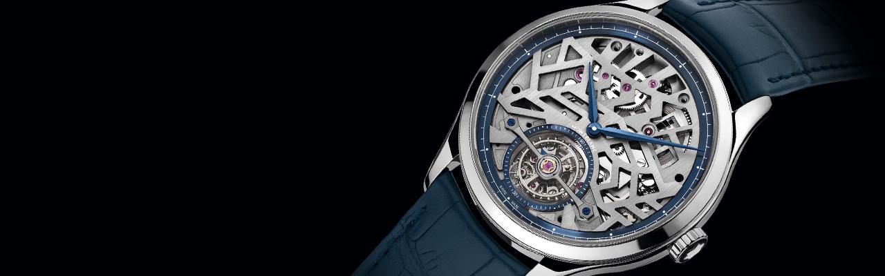 因此,我們可以從鏤空的機板上,窺見鏤空的發條盒與內部捲曲的發條,以及鍍銠的微型自動盤的擺動。但是為了避免特殊的鏤空機板影響閱讀性,萬寶龍也特別使用藍色劍型時、分指針搭配深藍色外環,而外置陀飛輪旁也設有60秒的深藍色外環,結合陀飛輪下框架的三角形標記,成為小秒針指示功能。