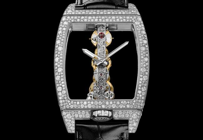 採用雪花鑲嵌工藝的兩款腕錶新品為金橋腕錶(34 x 51 毫米酒桶形錶殼)和金橋女裝腕錶(21 x 43 毫米)。這兩款腕錶的錶殼,包括錶冠在內整體均鋪鑲精緻美鑽,與垂直搭載於錶殼內,透過雙面防眩處理藍寶石水晶錶鏡清晰可辨的長方形機芯相映成趣。