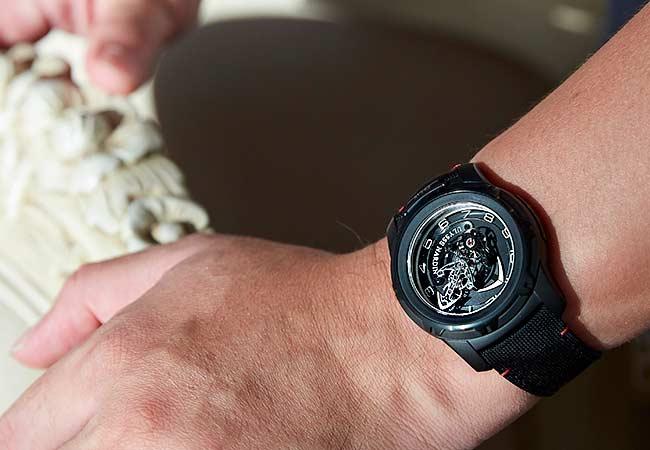 雅典錶的Freak Out直接露出傲視錶壇的獨特卡羅素機芯,正符合Frank的胃口。Freak奇想系列最早於2001年問世,不只配備了顛覆傳統的雙擒縱輪裝置,而且還開啟了機芯矽零件的先河,十多年下來持續演進、不斷革新,發展出許多先進技術與多種前衛錶款。Freak Out則是最新到貨的款式之一,這完全是Frank的菜。
