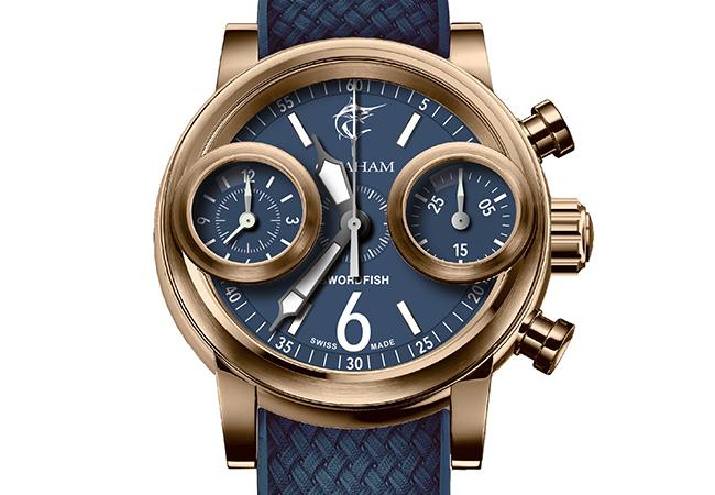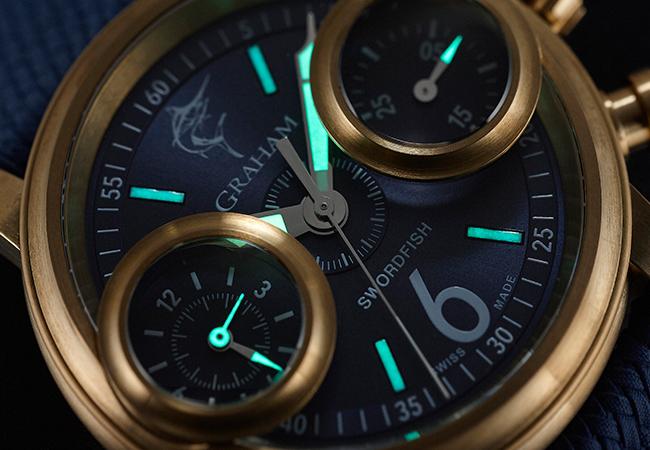 雖說是應市場要求而製作,但格林漢並未在此大張旗鼓地加入區域元素,而是回歸本質特色,強調的來自品牌精神的原汁原味。錶殼直徑46mm的大尺寸,但就Swordfish還有到48mm的款式來說,好像也算是相對溫和的尺寸,湛藍色面盤12點鐘位置有著象徵錶名Swordfish的劍魚圖騰。錶鏡上兩枚筒狀放大窗,彷彿大型魚類的眼睛,錶款名為Swordfish便源自於此。而這樣的設計對應到雙眼計時形式,也顯得恰到好處,正好用以取代雙眼計時的兩個小錶盤。此外,這兩個錶鏡也有放大功能,能把副錶盤的視覺面積放大20%,在判讀上會更為顯著。
