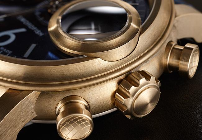 銅殼的特色,是會隨著接觸空氣而逐漸氧化,而隨著配戴與處理方式的不同,會生成不同的色澤。雖說近期有些品牌在面對銅殼時,會再處理過,使其不再氧化。而維持他們設定好的銅色。然而仔細想想,如此採用銅殼的意義何在?對於樂於此道的錶迷,藉由環境控制,刻意養銅,變化出更有個人風格的銅殼色澤,才是銅錶的魅力與趣味所在。而銅的變化不只氧化造成舊化感,也曾聽聞有錶友用銅油細心擦拭,讓銅錶殼產生不輸給玫瑰金的亮眼光澤,可算是變化多端。而青銅材質這樣的特色,在面對Swordfish這般,乍看大開大闔,但細節邊角轉折頗多的錶殼時,會有怎樣的變化,這想來該很耐人尋味。