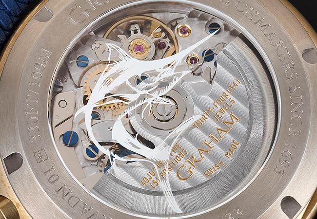 除了面盤上有劍魚圖騰外,透明底蓋上同樣壓印劍魚圖騰呼應系列名稱,透過底蓋也隱約可見內裝G1710自動上鍊機芯,這枚機芯可算是格林漢相當常用,可算是主力的計時機芯,每小時振頻28,800轉,並經過五方位校正,穩定與耐用度有一定的表現。這枚機芯是以7750為基礎修改而成,結構穩定,因為發展久遠,技術成熟,無論是實際配戴操作,或是維修保養上,都有一定的水準與便利。,而此枚機芯無論在Swordfish或是Chronofighter上都被廣泛運用,可見品牌對它的信賴。