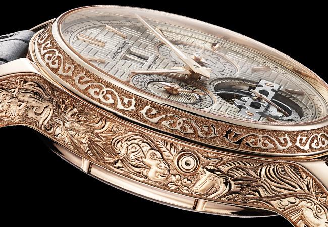 18K玫瑰金錶殼上以內填琺瑯雕刻技術所雕琢出的十二生肖圖騰是這只錶款的一大亮點。鼠、牛、虎、兔、龍、蛇、馬、羊、猴、雞、狗、豬,十二隻生肖年獸由錶殼右上方錶耳處開始,往下依序登場,順時鐘排列於錶殼外圍,從最先的鼠到最後的豬正好一圈,特別是虎頭位於錶冠,虎身融於錶身,錶耳間的空隙也不曾中斷,這連續性的細緻圖騰鋪陳出一幅環形的十二生肖卷軸,一氣呵成賦予錶作磅礡氣勢。而錶圈上新改換的中國式古典圖紋,也同樣採用了相同技法為整體潤色,同時也強化東方元素。值得注意的是,此內填琺瑯雕刻技術在成本上所費不貲,工序是先雕鑿小孔,營造蝸紋與光影效果,再使用內填琺瑯工藝作修飾。過程不僅考驗匠師巧手技藝,耗費的時間也多,尤其看最終成品上高達十二隻年獸各個維妙維肖、栩栩如生,這其中的珍貴價值就不難想像了。