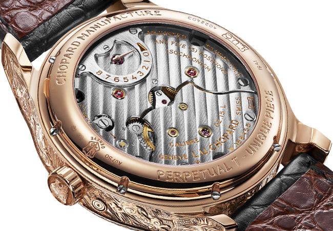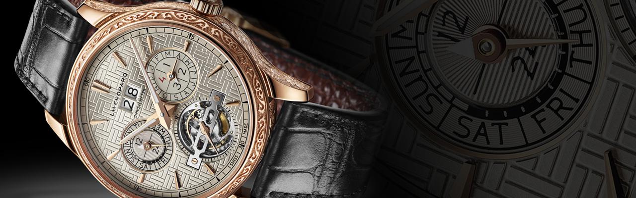 說完了外觀設計,再來看看功能層面。就像要配得起這樣大氣的設計,其內在也很高端地採用了囊括萬年曆和陀飛輪兩種複雜功能的手上鍊機芯L.U.C 02.15-L。從正面觀看面盤佈局,可見由兩個圓盤組合呈現的大日期雙視窗落於12點位置、3點位置同軸顯示月份和閏年、9點位置則同軸顯示星期和24小時指示。此枚機芯因為經過精確的計算、縝密的的齒輪配置,可自行分辨每月天數和閏年週期,數十年都不需調校,這特性似乎也正好呼應了十二生肖主題,紀年循環往復,周而復始綿延不絕,可說是為表裡做了最好配搭。而陀飛輪裝置則以拋光橫貫的不鏽鋼橋架固定於面盤下方6點位置,用來抵銷地心引力影響,以確保走時精準。結合兩種複雜功能,此錶款除了在外觀上展現藝術魅力外,內裡的技術層級與實用性能也同樣到位。