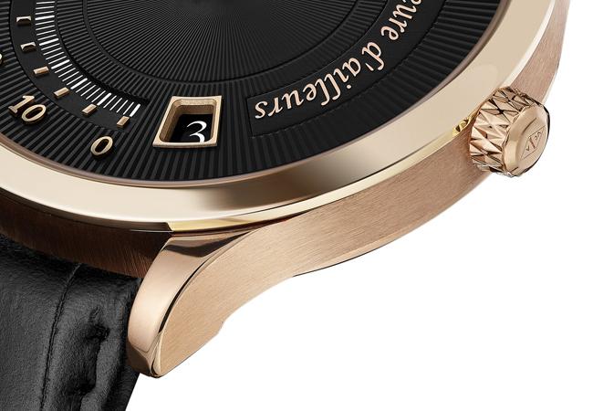 另一方面,和兩個日期窗與Heure d’Ici & Heure d’Ailleurs字樣連結成一個圓形的,就是位於面盤5點到11點位置之間呈現扇形區域的逆跳分鐘顯示了。其刻度以10分為區間,以玫瑰金數字時標標示。當腕錶運作時,逆跳分針走至六十分鐘時標後便會立即跳回零分位置,其視覺效果動感給力,搭配雙跳時的同步作動,在閱時上充滿樂趣。