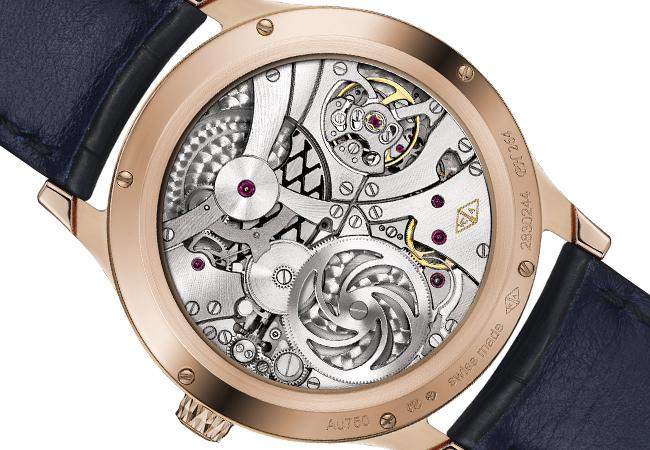 翻至錶背可透過透明錶底蓋見到機芯內部,由大致結構看來與舊作極為相似,相信這次所搭載機芯,亦由舊作機芯衍生而來。這枚機芯是由品牌與AGENHOR錶廠(Atelier Genevois d’Horlogerie)合作開發,由單一錶冠可操作所有功能。當初為裝進以纖薄輕巧為特色的Pierre Arpels錶殼,自然影響到機芯設計,比如使用減少機芯厚度的微型自動盤,其上可見標誌的蜂巢紋理加工。