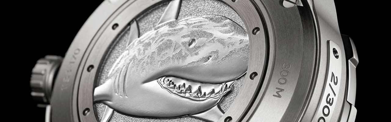大白鯊潛水天文台限量腕錶所展現的是另一種風貌,鈦灰與純白的配色散發出大白鯊孤高的氣質,而畫龍點睛的藍則象徵了與海洋的淵源。橡膠錶帶上的金屬飾片上刻畫著大白鯊的側面線條,底蓋還有氣勢如虹的大白鯊浮雕(請見置頂橫圖)。裡面裝載的是強如鯊魚心臟的雅典錶UN-118自動機芯。