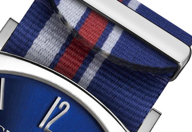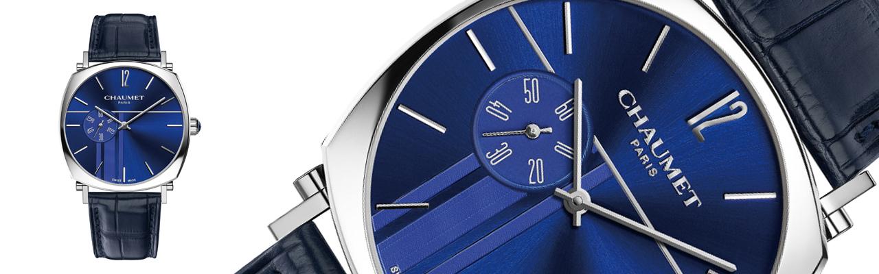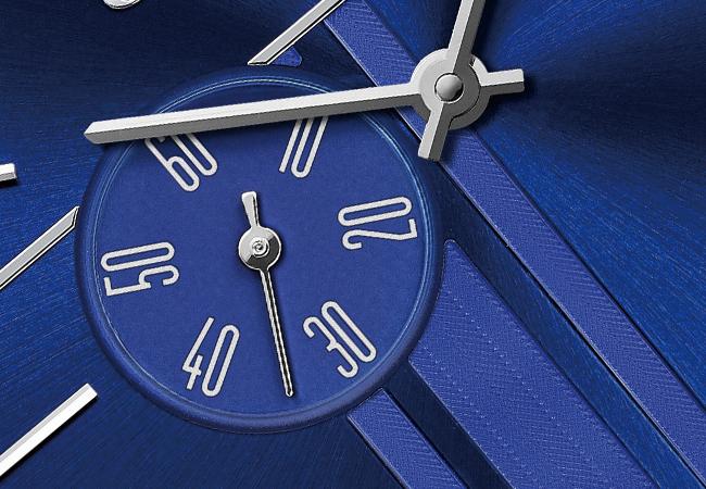 外方內圓的設計搭配簡約的面盤佈局、修長棒狀的時標與指針設計、面盤上取材自20年代的Bayadere條紋修飾,以及錶耳處的內收折角,錶款整體流露復古又簡約的典雅氣質。這款小三針將小針盤設於面盤9點位置以數字呈現,視覺上比同時推出的另外兩款豐富些。盤面則選用近來流行的藍色,並以亮面拉絲紋處理,不僅好看也與鑲上藍寶石的錶冠相襯。