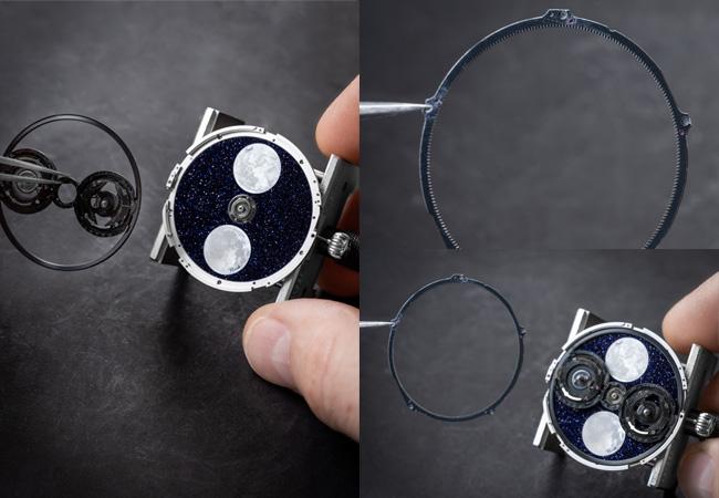 不過當他們觀察到市面上各大品牌的月相功能,卻多半延續著從懷錶而來的配置,就是把月相盤設計在一個小小的月形視窗裡,看起來不夠醒目、也無法清晰辨識,如果愛馬仕想要把月相,作為腕錶上明顯的設計重點,就不能用過去的視覺來規劃,這也表示,愛馬仕必須在開發技術上得重新來過。