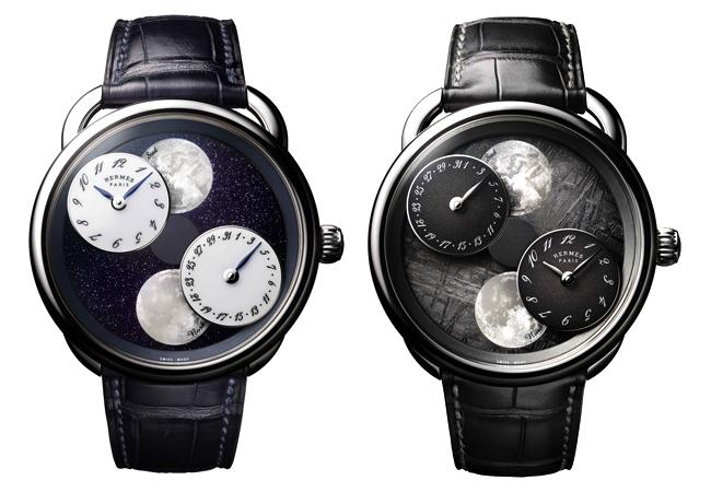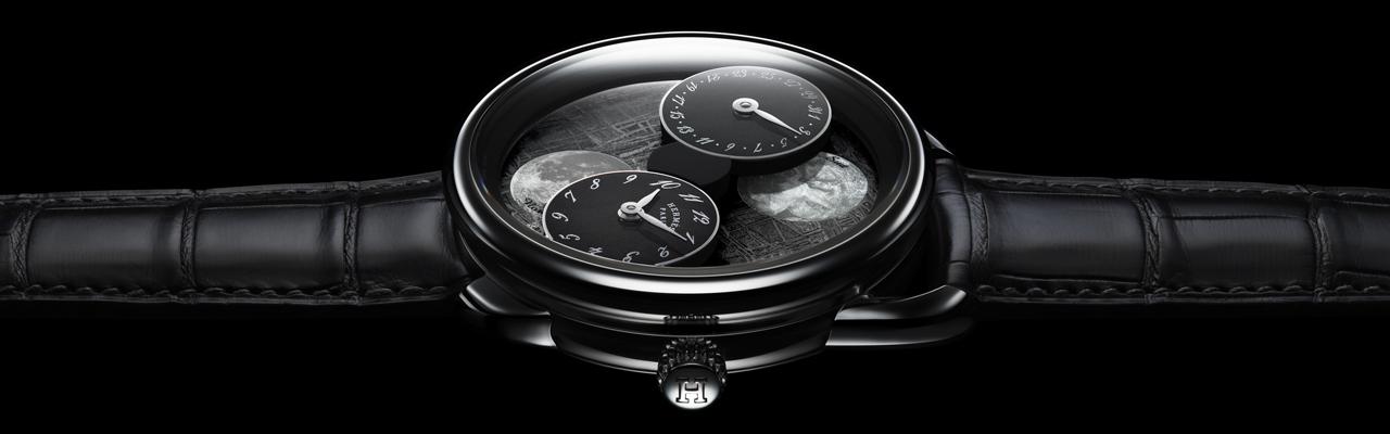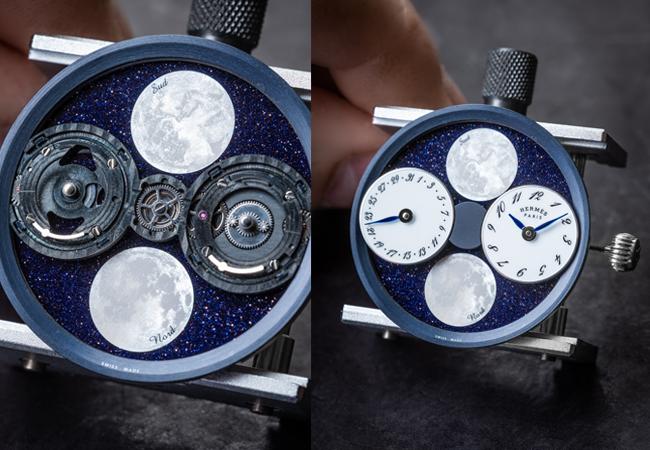 愛馬仕HERMES在2019年發表了品牌有史以來最複雜、結構最特殊的月相顯示功能──Arceau月讀時光腕錶(Arceau L’Heure de La Lune),利用了懸浮在面盤上的時間、日期盤,使它們相連成為一個雙盤結構,藉著該結構的旋轉,遮蔽了面盤上12點鐘、6點鐘擬真月亮的多寡,來顯示南、北半球當下的月相狀態,這樣的設計確實是前所未見。