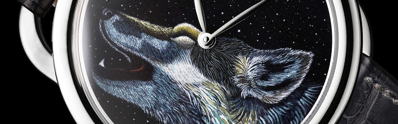 此款全新 Arceau 腕錶名為「Awooooo!」,圖案源自愛馬仕男士圍巾。畫面描繪了傳說與童話故事中迷人但令人畏懼的白狼在樹林中現身,運用微繪琺瑯工藝在錶盤上呈現,散發野性的光輝。為了重現原設計畫面的精緻華美,白狼及星空背景採用極為細膩的工序製作,令圖案效果栩栩如生。