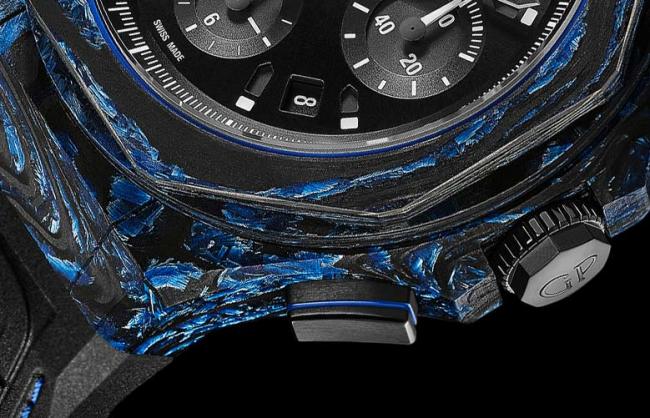 強力壓縮工藝的運用不僅賦予材質出色的均勻、同質特性,也大幅提升了材質密度,進而成就超凡卓越的密封性。而外觀上也獲得了完全不同於其他碳材質的平暢光滑質感——360度全方位均勻、順滑。該材質的藍色外觀得源於其採用的的玻璃纖維,但也能打造成其他顏色,甚至可以以材質如金屬取代。另一大創新特點是該材質的超強硬度,是其他類型的碳材質無可比擬。玻璃碳的硬度超出精鋼100倍。此外,它的目標用途不僅僅在於「包裝」時計的外觀:其密度接近1,實際上可以漂浮在水上 (精鋼的密度大約為8,鈦金屬密度約為4.5)。這種全新材質將用於Laureato桂冠系列Absolute計時碼表,並即將於2019年日內瓦高級鐘表展 (SIHH) 的預覽活動上率先亮相。