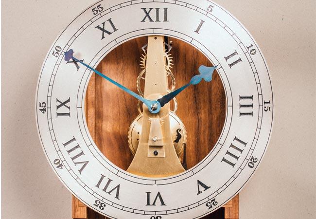 鐘殼:我以CAD設計鐘殼,並使用CNC切割器來切割組件。首先以中密度纖維板完成原型,然後以美國黑胡桃木打造成品並以手工組裝。