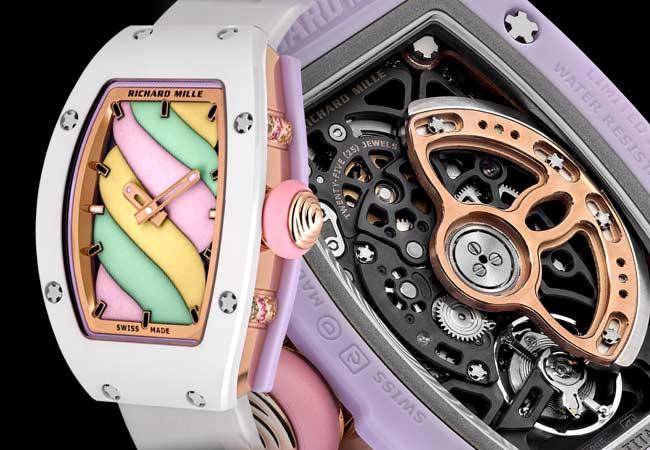 Sweets系列的四個錶款採用雙色陶瓷錶殼造型,以大明火琺瑯飾面或黑色鈦金與鉻金巧妙演繹美味糖果。RM 07-03 Cupcake、RM 07-03 Marshmallow、RM 37-01 Sucette、RM 16-01 Réglisse爭相鬥豔,呈獻多樣美味。不僅如此,品牌還通過精湛的琺瑯工藝技術,將口中美味幻化為悅目的視覺感受,忠實再現爽口、香脆、嫩滑的舌尖樂趣。