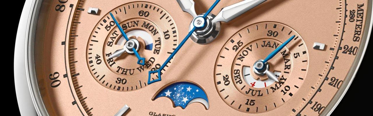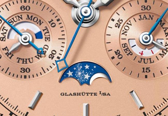 整個矚目組合與如今的DATOGRAPH PERPETUAL TOURBILLON相互呼應。錶殼直徑更大,意味著可擴展副錶盤,用於容納萬年曆的顯示。小秒針、星期和日/夜指示位於左側;精確跳分積分盤、月份和閏年顯示位於右側。三個隱藏式校正器可獨立調整月相、星期和月份顯示,而10時位置的綜合按鈕可同時推進所有日曆顯示。佩戴者可透過藍寶石水晶玻璃底蓋觀賞由729個零件組成的L952.2型錶廠自製機芯。此枚機芯的每個細節皆由人手修飾,一絲不苟,其複雜之處足以體現朗格致力突破機械製錶界限的決心。