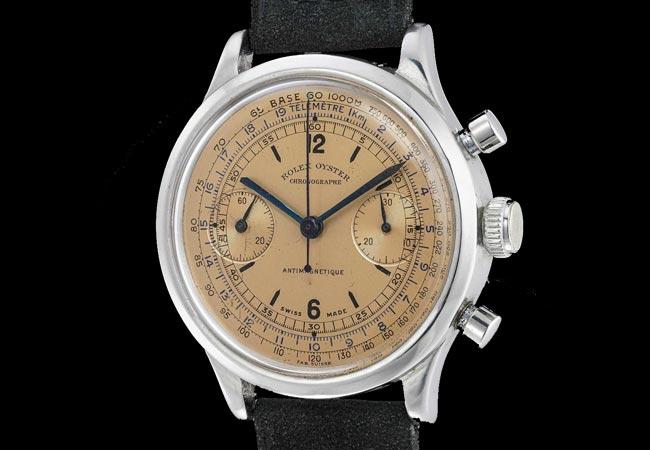 這枚計時腕錶的鎖入式底蓋,相當特別,有別於常態我們所見的設計,這設計必須要透過Rolex所開發的開啟機具來開啟。從正面來看,這類計時腕錶的錶盤極為複雜,因為這可是早期隨身攜帶的計測儀器,錶盤上有測速,測距或是測脈搏的計儀,這是身為科技現代人所想像不到境界。