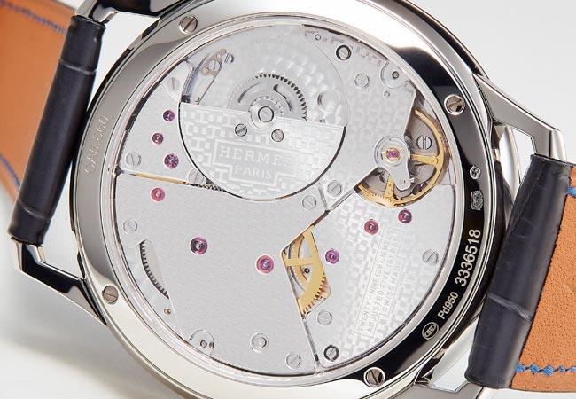 透過錶背的透明底蓋,我們可見到輔助薄型設計的微型自動盤,以及以手工倒角處理,綴滿愛馬仕象徵H字母雕刻飾紋的機芯夾板。功能模組上也飾有日內瓦波紋和渦形紋打磨處理,相當精緻。此錶款振頻每小時21,600轉,動力儲存42小時,共限量發行120只。