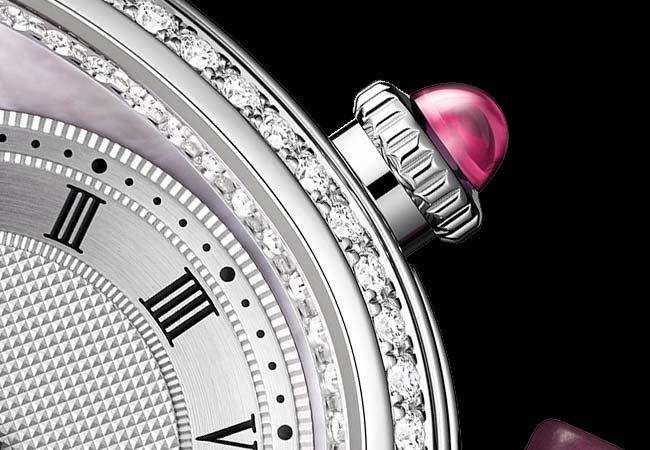 全新Reine de Naples那不勒斯王后系列8905情人節限量特別款,面盤裝飾具有變彩效果的粉紅色珍珠母貝。表情豐富的一輪明月,伴隨著繁星點點,高掛在深邃的粉紅醉人夜空之中。錶冠上鑲有粉紅色藍寶石,紫紅色鱷魚皮錶帶,賦予整體優雅永恆美感。錶圈與面盤外緣鑲嵌奢華美鑽,臻於完美,無懈可擊。