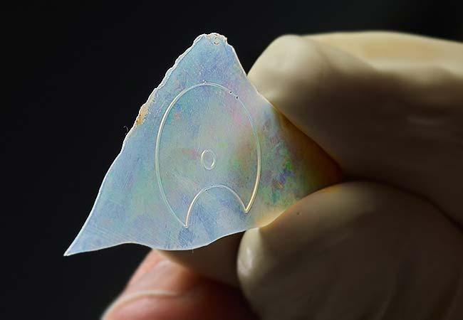 當中單件式的主夾板蓋的中心部分容納小秒針盤和平衡擺輪,故中央位置呈“8”字形。工匠其後將蛋白石切片用樹脂固定在黃銅塊上,然後用鑽石粉末和水的混合物在玻璃板上打磨至合適厚度 – 小錶盤的厚度為0.28mm,主板蓋的厚度為0.35mm。實際上,蛋白石切片比需要的多了0.06mm,因此有足夠的厚度用於拋光階段,包括將蛋白石輕輕地壓在沾有氧化鈰溶液的細毛氈轉盤上。由於每枚蛋白石錶盤和主夾板蓋都不相同,並且每個微型擺陀的鑽石鑲嵌排列方式也是有分別,即每枚Insight Micro-Rotor Lady Opal時計皆獨一無二。