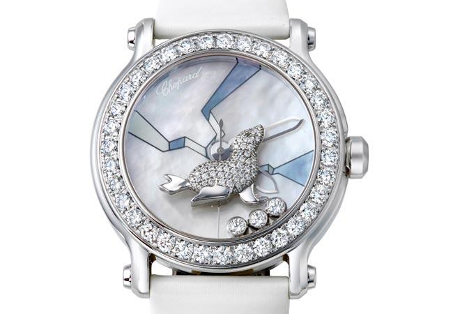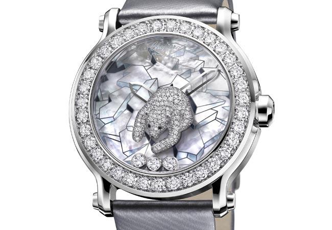 亦或是冰原極地的「北極熊」腕錶,白潤的北極熊身軀由163顆0.43克拉鑽石與2顆0.01克拉粉鑽以及3顆0.01克拉黑鑽而成,於雪白的珍珠母貝面盤上奔走,傳遞出蕭邦專業精湛的珠寶工藝和童心未泯的創意。18K白金腕錶,錶框鑲嵌36顆鑽石共重3.65克拉,錶冠鑲嵌3顆鑽石重0.3克拉,三顆滑動鑽石重0.30克拉。