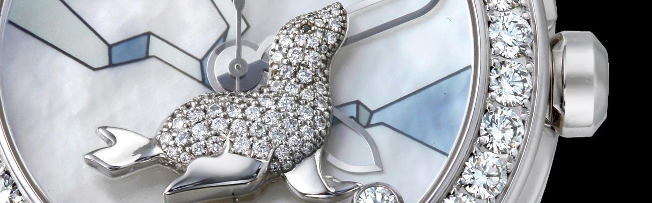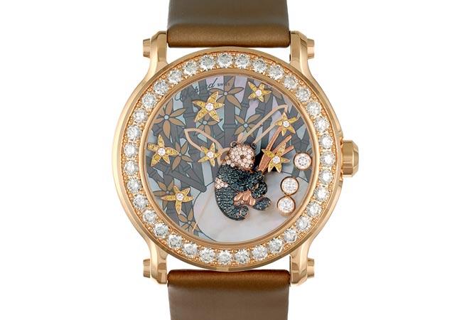 最引人注目的「貓熊」腕錶,在一片密叢的竹林中,一隻天真無邪的貓熊正坐在雪白的地上啃著竹葉。貓熊由83顆黑鑽,54顆黃鑽,及65顆白鑽鑲嵌而成,身後彩繪的竹林以及由18K玫瑰金訂製而成的立體竹葉為表面帶來了層次。造型滿佈的竹葉像繁星交錯。其錶款鑲嵌總重3.97克拉鑽石、0.01克拉紅寶石以及0.56克拉黑鑽,三顆滑動鑽石重0.30克拉。「飛燕」腕錶則呈現南國婉約柔媚的風情。燕雀南飛至繁花盛開的溫暖故鄉,珍珠母貝面盤上雕刻彩繪的紅花綠葉,與由119顆黑鑽與2顆紅寶石,以及8顆白鑽鑲嵌而成的燕身,結合成一幅奇異的美麗畫面。