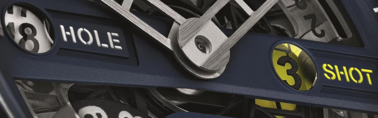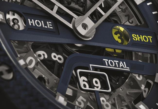 位於2點鐘方向,宛如高爾夫球推桿一般的按把,可啟動「揮桿數顯示機制」,可紀錄揮桿次數並計算每一洞的桿數。位於4點鐘的按把,則讓佩戴者能夠在下一洞比賽開始時,重新歸零計算桿數。位於6點鐘的計數器,可顯示總桿數,並隨著比賽進行及時更新。位於8點鐘方向的按把,造型宛如發球座,用來重啟計時機制,在比賽結束時可重新將成績紀錄歸零。