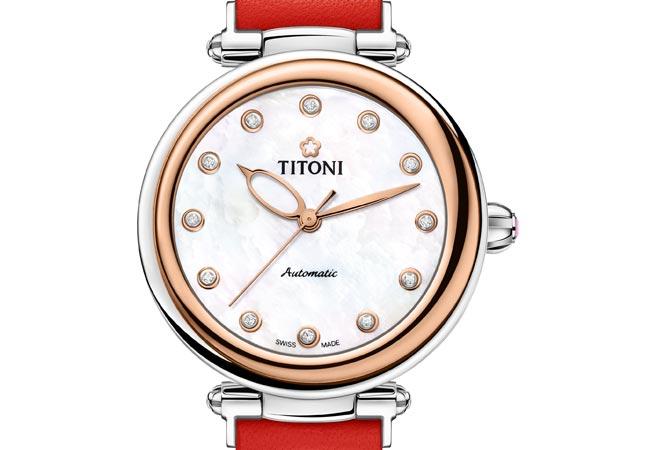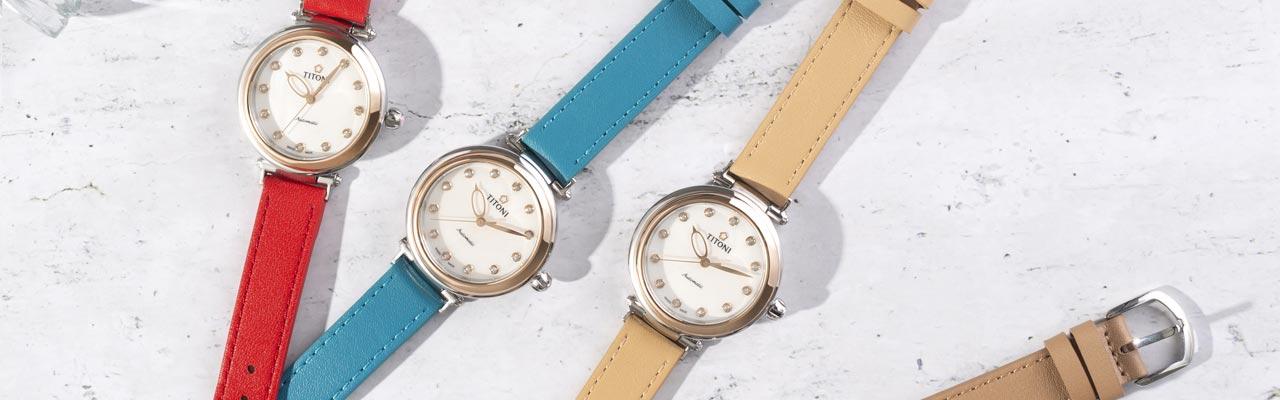 TITONI瑞士梅花錶炫美系列新品在2018年底以全新漾采多變的快拆錶帶設計正式為百年慶賀暖身開啟序幕。Miss Lovely時尚快拆系列,運用色彩繽紛的特色,詮釋都會女性的優雅之外,又同時具有獨特的俏皮魅力。延續著舊款的經典系列,改款的腕錶除更具美感,也增加了「時尚快拆」功能(Quick Change System),賞心悅目的全新配色皮帶與鏈帶款,融入俏皮元素也豐富了TITONI經典的女性魅力,帶來別緻的可愛感。