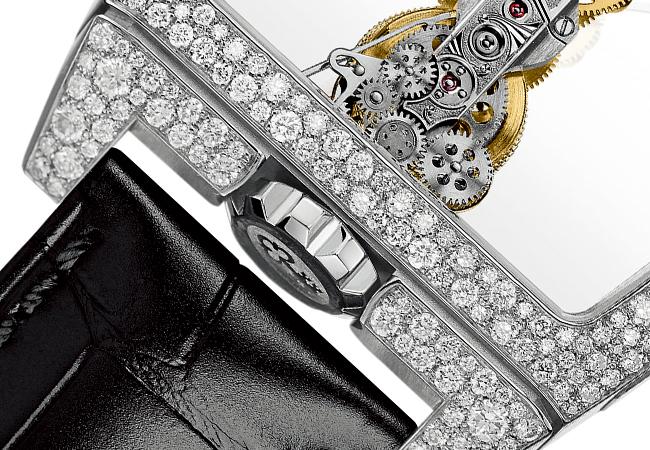 這種技法的可貴之處在於,打破一般鑲嵌工藝中可替換鑽石的標準化模式,將數量不定、切工各異、大小不一的鑽石緊密貼合,完全覆蓋金屬表面,這需先巧妙安排位置佈局後,再以精細手法對不同形狀鑲爪進行加工,十分考驗技術。在匠師的手藝下,其錶殼連至錶耳處都滿佈晶瑩美鑽,如白雪紛落、如壁畫般和諧連貫。