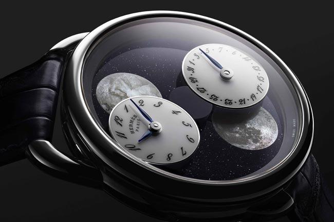 沿用數百年的月相顯示終於被改變,前所未有的雙圓盤錶橋,除了顯示時間日期,還會自轉遮擋月相以顯示月亮當下圓缺。愛馬仕HERMÈS發表了品牌有史以來最複雜、結構最特殊的月相顯示功能─Arceau月讀時光腕錶(Arceau L’Heure de La Lune),利用了懸浮在面盤上的時間、日期盤,使它們相連成為一個雙盤結構,藉著該結構的旋轉,遮蔽了面盤上12點鐘、6點鐘擬真月亮的多寡,來顯示南、北半球當下的月相狀態,這樣的設計確實是前所未見。