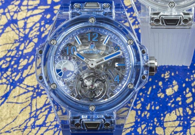 宇舶錶早已成為駕馭藍寶石材質的先驅,今年更推出藍色藍寶石鏤空陀飛輪腕錶,運用藍寶石框架將陀飛輪懸空於透明錶殼之中,從錶殼、面盤、錶帶延伸至機芯,讓陀飛輪的鏤空機械裝置彷彿消失於無形,搭載宇舶自製HUB6016手動上鍊五日動力儲存鏤空陀飛輪機芯,藍色卻透明設計彷彿穿透時間,並突破製錶領域的疆界。