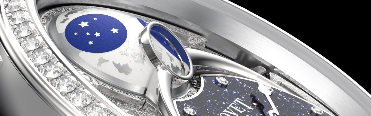 傾斜的書寫斜面錶殼是播威擁有者Roffy親自設計,向六點位置傾斜的殼型,結合品牌一貫的古典手藝,著實典雅。除了首度用於女錶,此外43X28,7mm的橢圓形殼型,也是品牌女錶首次出現的造型尺寸。十二點鐘位置弧面的月相盤、砂金石面盤,層次感十足。特殊的時分指針,重疊時會拼出個小小愛心,則是設計的巧思。43 x 28.7mm/18K白金鑲鑽/參考價NTD 1,802,000。