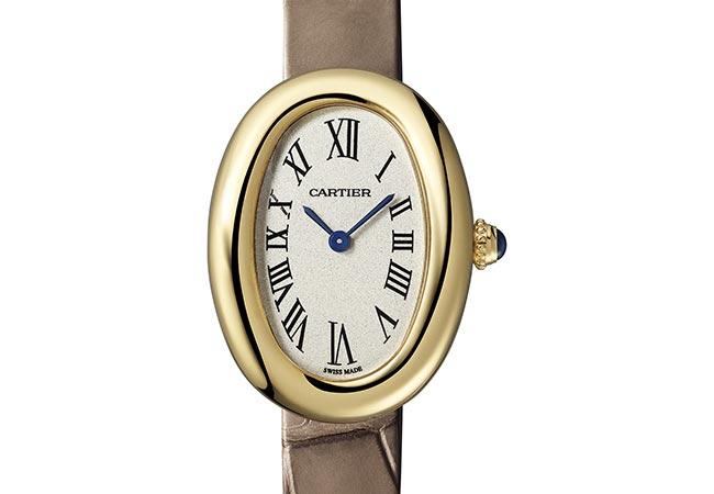 以1958年推出款式為原型,融入以浴缸為靈感來源的橢圓形錶殼,黃K金的Godron圓紋鑲邊曲線優美,面盤上的羅馬數字時標經重新演繹。小型款/18K黃金/參考價約NTD337,000起