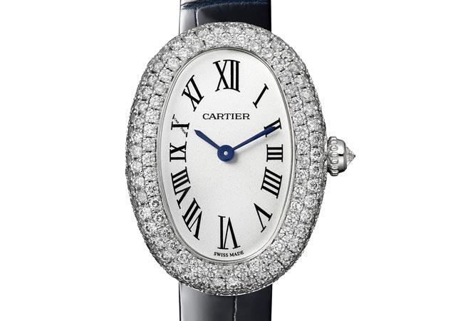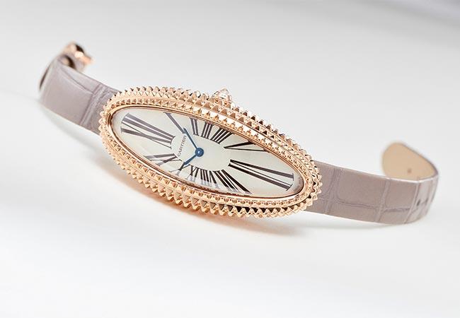 作為Baignoire的延伸,這款在尺寸上較大,向上下拉伸而顯得更加修長的橢圓造形錶殼,帶來更柔美氣質,面盤上羅馬數字時標也同樣被擠壓而朝上下延展。中型款/玫瑰金/參考價約NTD 845,000