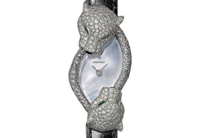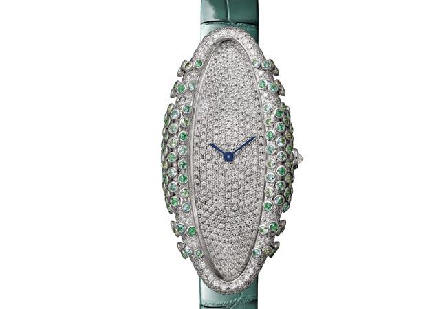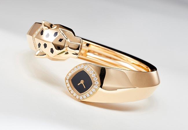 彷若手鐲,一端雕飾豹頭、一端置放面盤的設計十分有趣,面盤似豹尾一般翹起,豹眼以祖母綠、豹紋以黑色真漆裝飾。18mm/18K黃金/參考價約NTD 3,450,000