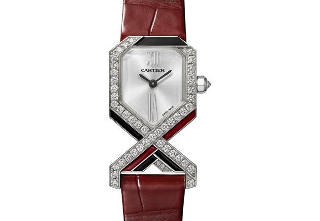 多角形結合交錯的直線線條展現幾何美學,錶殼上除了鑲嵌鑽石,也裝飾紅色和黑色琺瑯條紋,增加時尚氛圍。18K白金/限量50只/參考價約NTD 1,340,000