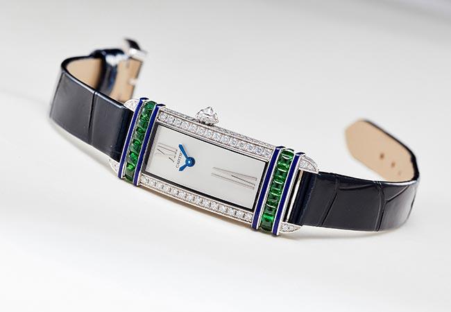 長方形錶殼展幾何之美,左右兩側延伸至錶耳處各鑲嵌有一排鑽石,上下兩條短邊則鑲嵌綠色沙弗萊石,以象徵吉祥和繁榮。18K白金/限量100只/參考價約NTD 1,920,000