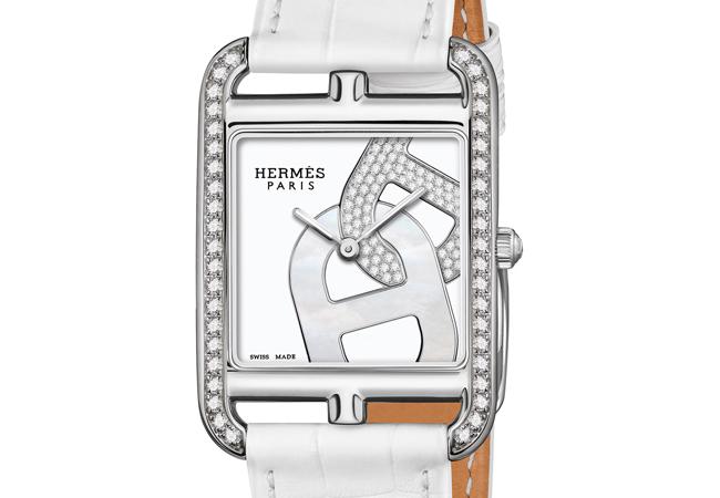 配合面盤整體愛馬仕Logo偏移至左上角,而為加強時尚感, 錶殼兩側還添上兩排璀璨鑽石。29X29mm/不鏽鋼/參考價NTD 355,400