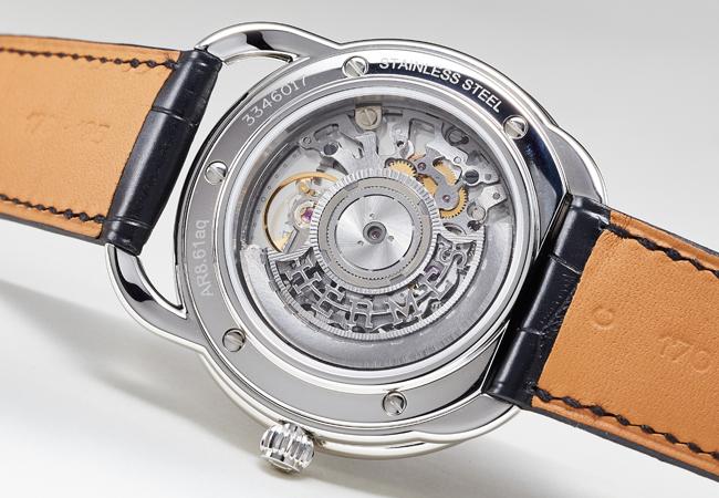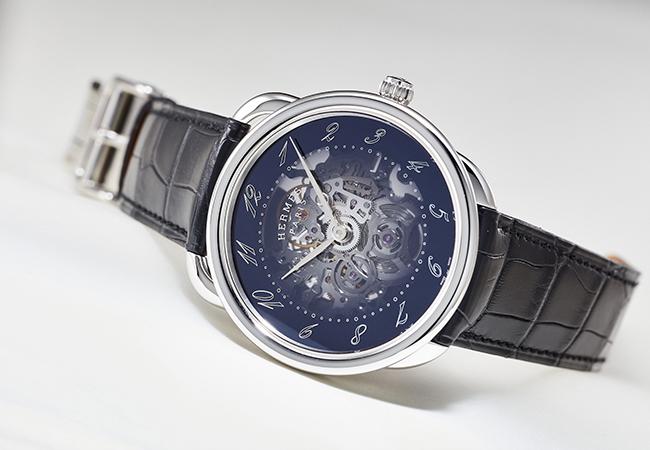 面盤採透視可見內部機芯,由中心向外加深色彩的漸層設計帶來唯美朦朧感,時標字也以鏤空對應,機芯由2892改造而來,自動盤上有HERMÈS字鏤雕裝飾。41mm/不鏽鋼/參考價NTD 317,100