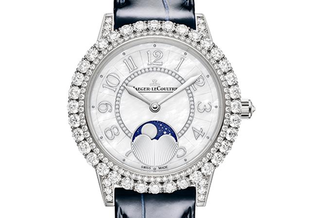 積家在約會系列月相珠寶腕錶上使用全新的爪鑲工法,讓鑽石能接收到最多的光線,增加鑽石的折射效果,腕錶共鑲嵌186顆鑽石(3.52克拉)。搭載新款的925B/1自動機芯。36mm/18k白金/參考價NTD 1,620,000