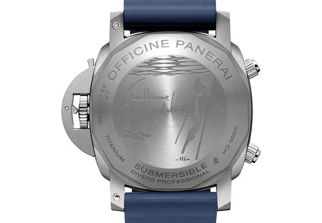 今年沛納海共推出兩款Guiaume Nery專業潛水計時腕錶,但是本錶款沒有限量。不過卻是沛納海首度採用藍色陶瓷錶圈,並且搭配特殊的鯊灰色面盤。而錶底蓋鐫刻Guillaume Néry的簽名、茉莉亞島的圖像,以及下潛126米紀錄的圖案。型號PAM00982/47mm/鈦金屬/參考價NTD 597,000