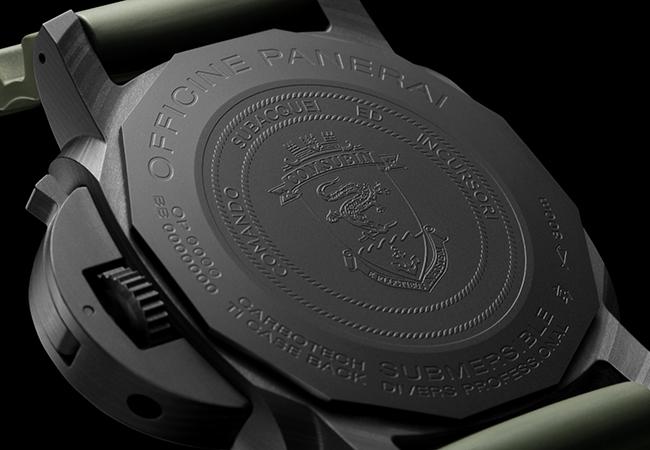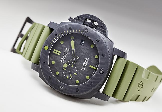 沛納海因為意大利海軍潛水突擊隊而進入軍用錶的領域,此次沛納海以突擊隊為靈感,推出兩款具輕盈碳纖維錶殼的專業潛水錶;錶款搭載P.9010自動機芯,搭配特殊迷彩黑面盤與綠色橡膠錶帶。購買這款限量33只腕錶的收藏家,還可參與意大利海軍潛水突擊隊「Comsubin」的訓練環節。型號PAM00961/47mm/Carbotech碳纖維/參考價NTD1,258,000