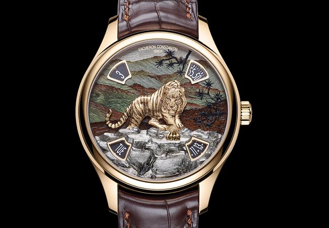 內裝2460 G4自動上鍊機芯。立體金雕老虎與岩石生動活躍,細木鑲嵌的背景則用超過百片,最多達20種不同木片,依其色澤拼貼而成。41mm/18K粉紅金/參考價請電洽