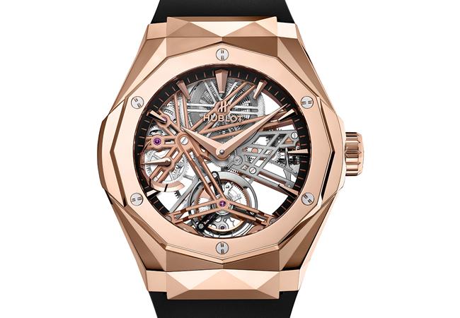 除了藍寶石水晶錶殼外,Orlinski陀飛輪同步發表採用皇金、黑陶瓷兩種款式。內裝Hub 6021手上鍊機芯,五日動力儲存。皆限量30只。45mm/皇金/參考價請電洽